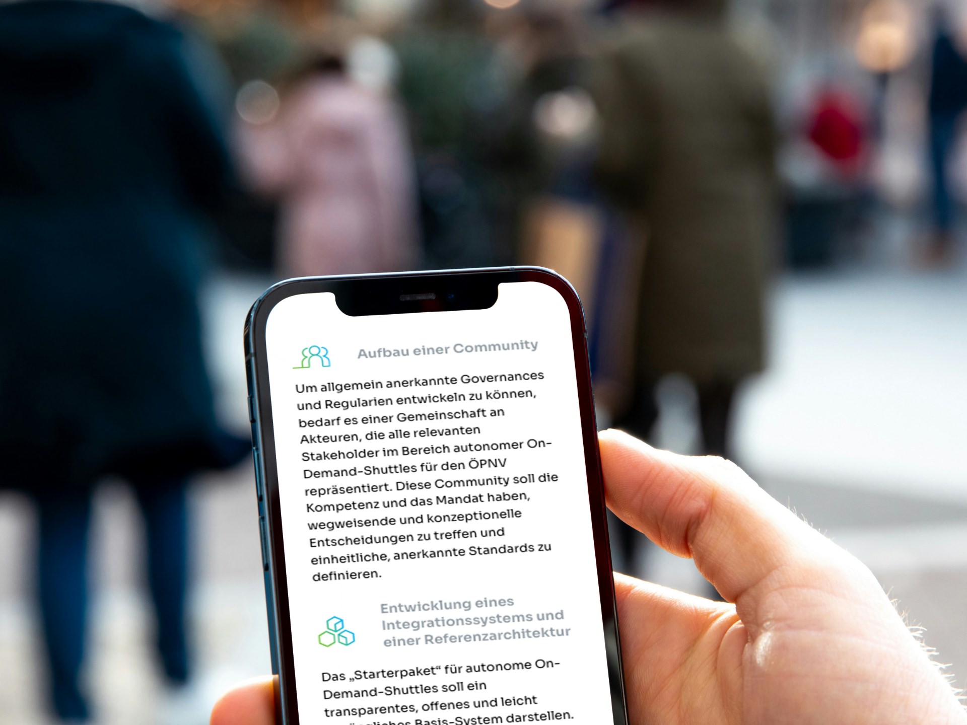 Akteure aus Industrie, Wissenschaft und öffentlicher Hand werden gemeinsam technische Blaupausen, Referenzarchitekturen, einheitliche und akzeptierte Standards und Regeln konzeptionieren, entwickeln und implementieren. Das Ziel: das digitale ‚Starterpaket‘ für den autonomen, individualisierten öffentlichen Verkehr – unabhängig, offen und für alle nutzbar.